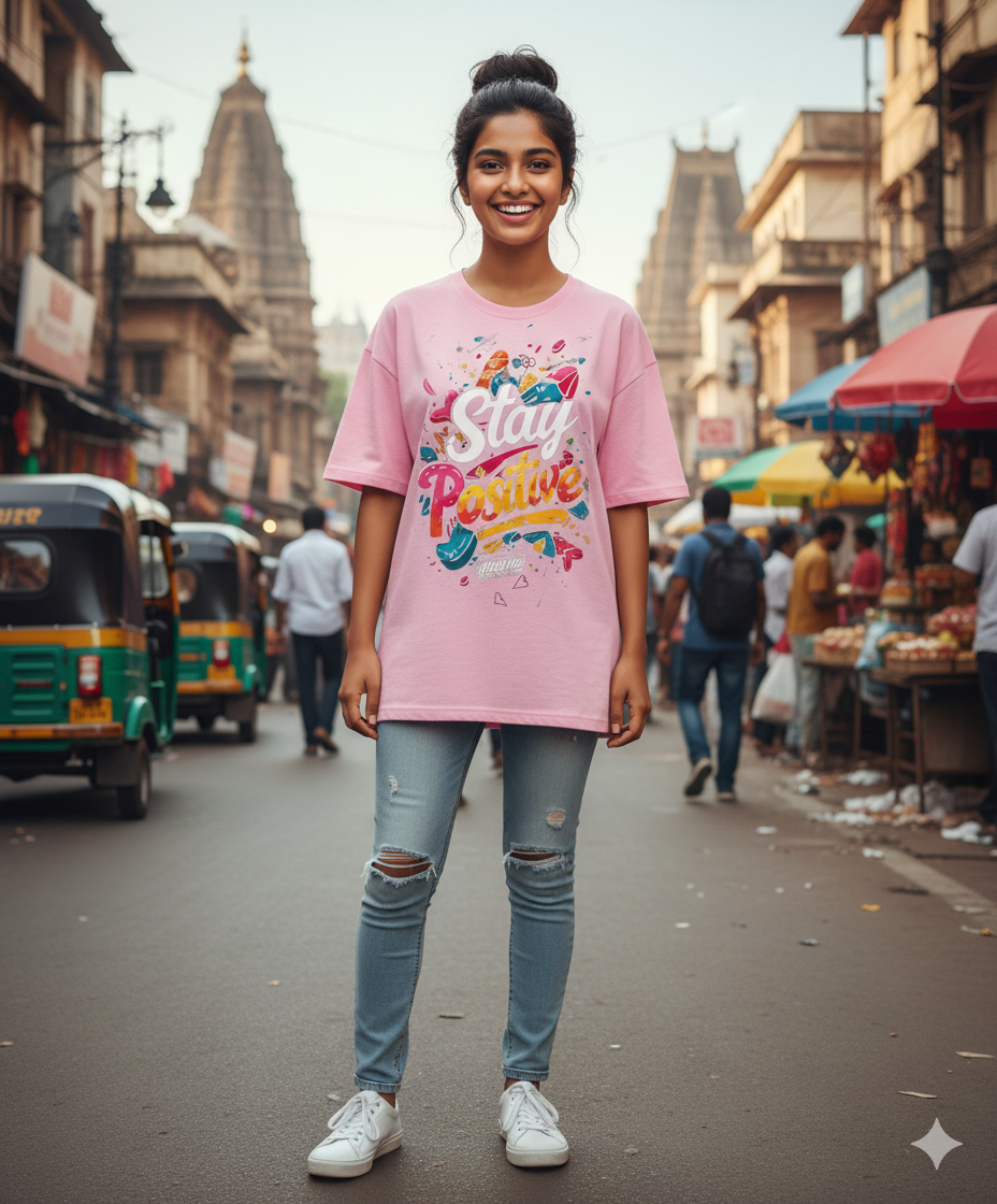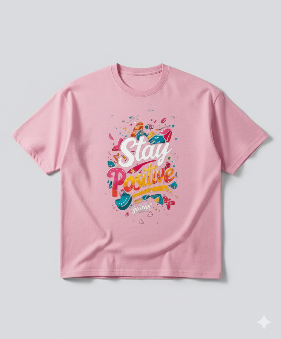 Bring good vibes everywhere you go. This 220 GSM premium cotton tee blends streetwear style with uplifting energy — featuring a bold, colorful ‘Stay Positive’ graphic that pops. Soft, breathable, and made for all-day comfort, this comfort-fit essential is your new mood booster.